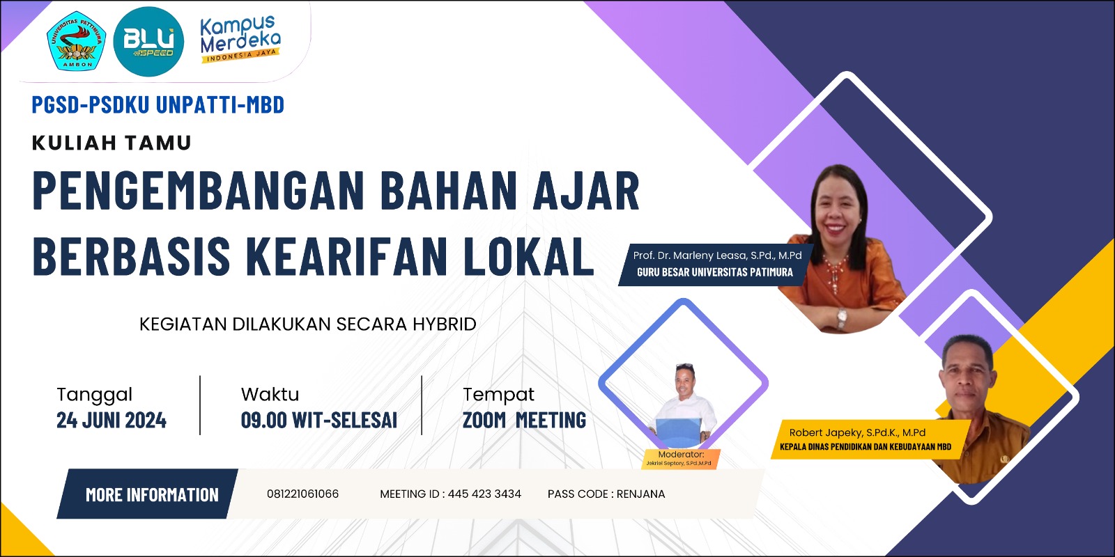 Tiakur, 24 Juni 2024 — Program Studi Pendidikan Guru Sekolah Dasar (PGSD) PSDKU Universitas Pattimura yang berlokasi di Kabupaten Maluku Barat Daya (MBD) sukses menyelenggarakan Kuliah Tamu dengan tema “Pengembangan Bahan Ajar Berbasis Kearifan Lokal”, pada Senin, 24 Juni 2024. Kegiatan ini digelar secara hybrid, menggabungkan kehadiran langsung dan daring, sehingga dapat menjangkau lebih banyak peserta, khususnya mahasiswa dan tenaga pendidik di wilayah MBD.