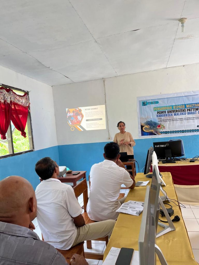 Sesi terakhir dibawakan oleh Titin Kempa, S.Si., M.Pd., dosen PGSD PSDKU Kabupaten MBD, yang memaparkan penerapan metode scramble secara offline. Metode ini efektif, murah, dan relevan untuk sekolah di pulau kecil. Peserta belajar menyusun soal, membuat lembar kerja, serta memadukan metode scramble dengan pendekatan deep learning agar siswa tetap aktif dalam berpikir. Diskusi penutup berlangsung hangat, dengan guru-guru berbagi pengalaman mengajar di wilayah perbatasan dan mendapatkan saran praktis untuk meningkatkan kreativitas pembelajaran.