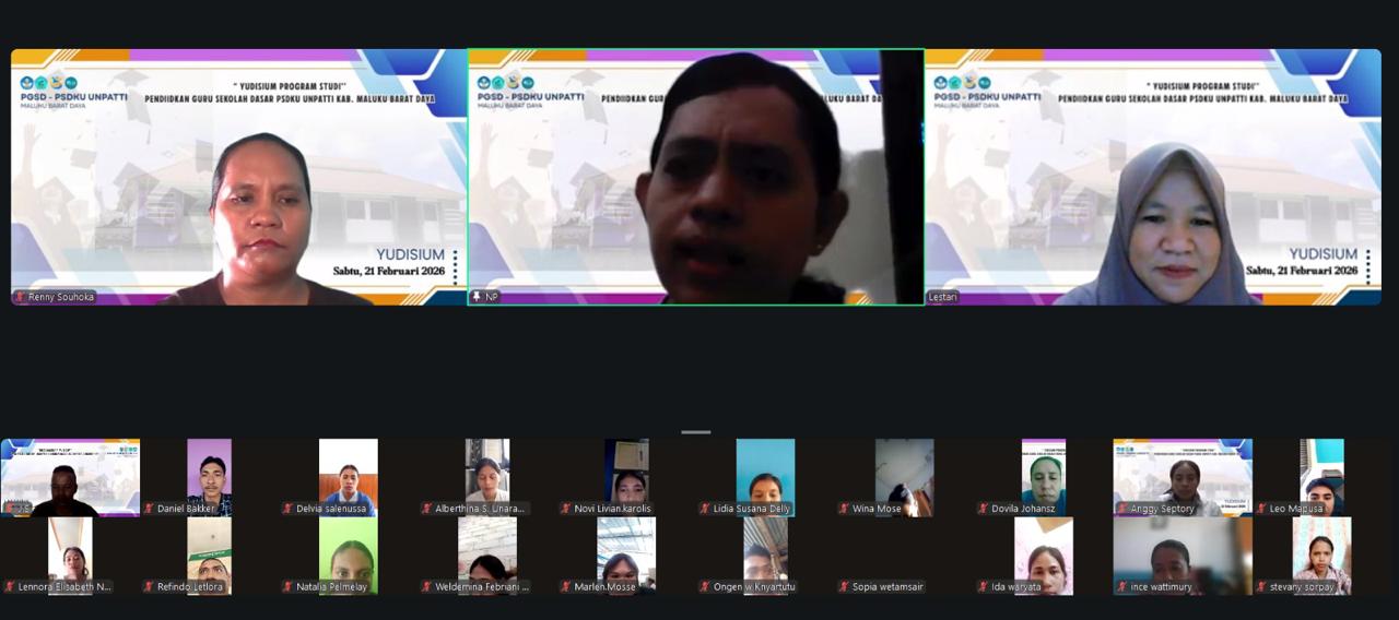 Program Studi Pendidikan Guru Sekolah Dasar (PGSD) Universitas Pattimura Kabupaten Maluku Barat Daya melaksanakan kegiatan Yudisium Semester Ganjil Tahun Akademik 2025/2026 secara daring pada hari Sabtu, 21 Februari 2026. Pelaksanaan secara virtual ini dilakukan sebagai bentuk penyesuaian terhadap kondisi dan efektivitas koordinasi mahasiswa yang berada di berbagai wilayah kepulauan.